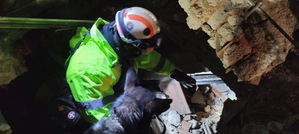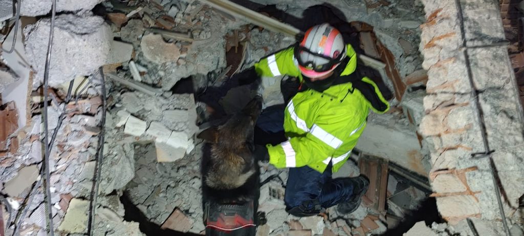 El binomio canino Ruger, en su primera participación, realizó un primer marcaje, por lo que con apoyo del técnico en estructuras colapsadas y maquinaria apropiada, logró la localización de 2 víctimas de los sucesos, madre e hija, cuyos cuerpos fueron rescatados para entregarse a su familia.
