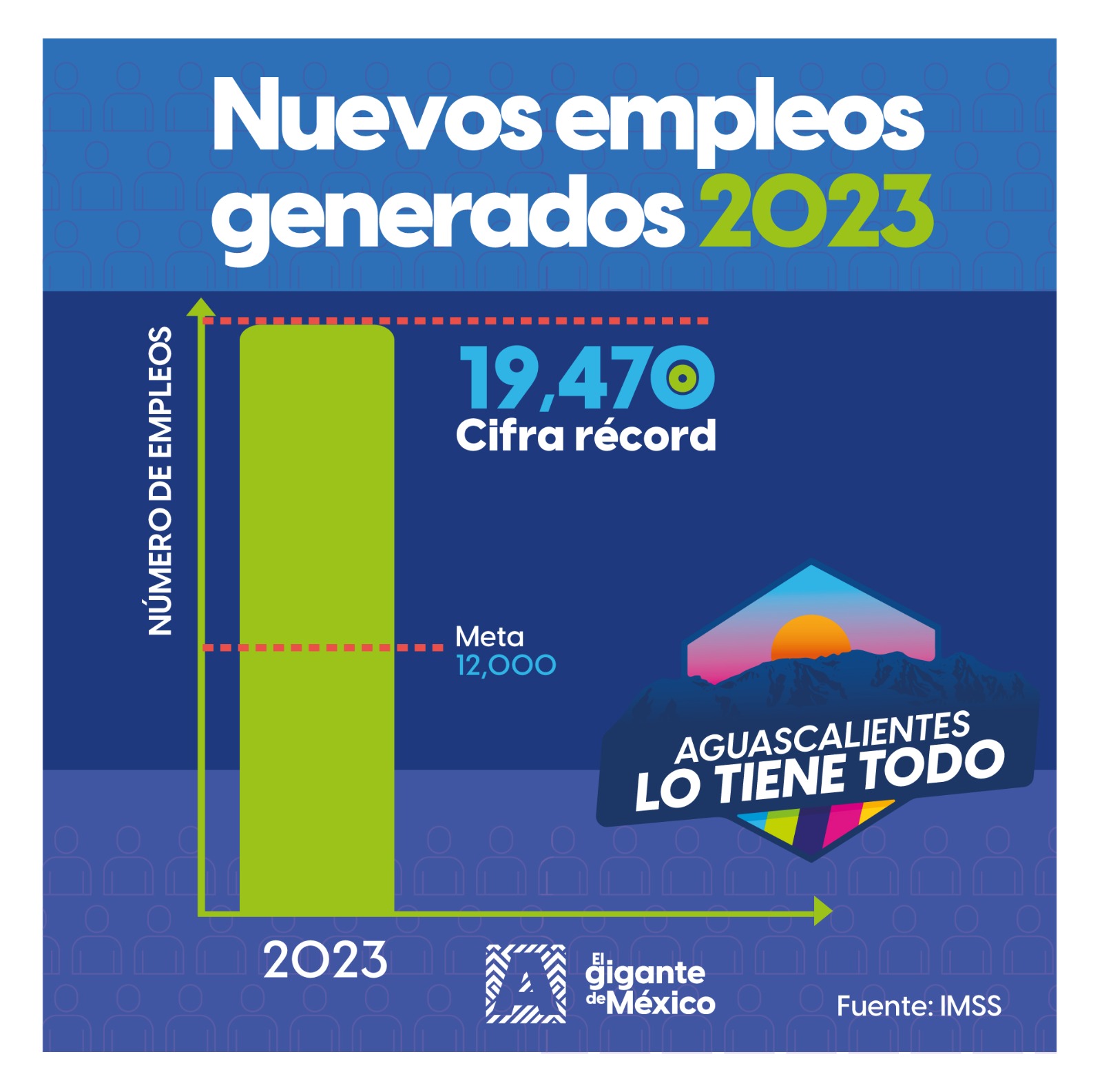 Al conocer los últimos datos del Instituto Mexicano del Seguro Social (IMSS), que indican que en Aguascalientes se crearon 19 mil 470 nuevos puestos de trabajo en los primeros 11 meses del año, la gobernadora Tere Jiménez aseguró que con esta cifra se supera ampliamente la meta establecida para el 2023, que fue de 12 mil nuevos empleos.