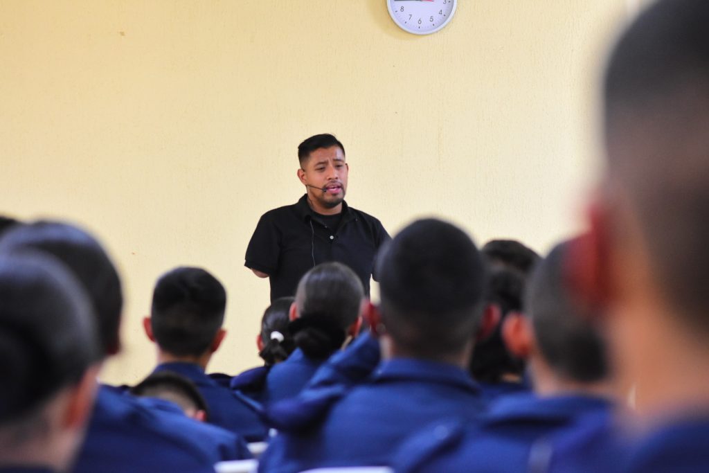 Durante las exposiciones, Silverio Samuel Aquino habla a las y los jóvenes sobre el accidente que le llevó a perder sus brazos y cómo ha vencido la depresión, las adicciones y ha salido adelante como un ejemplo de que se pueden superar barreras.