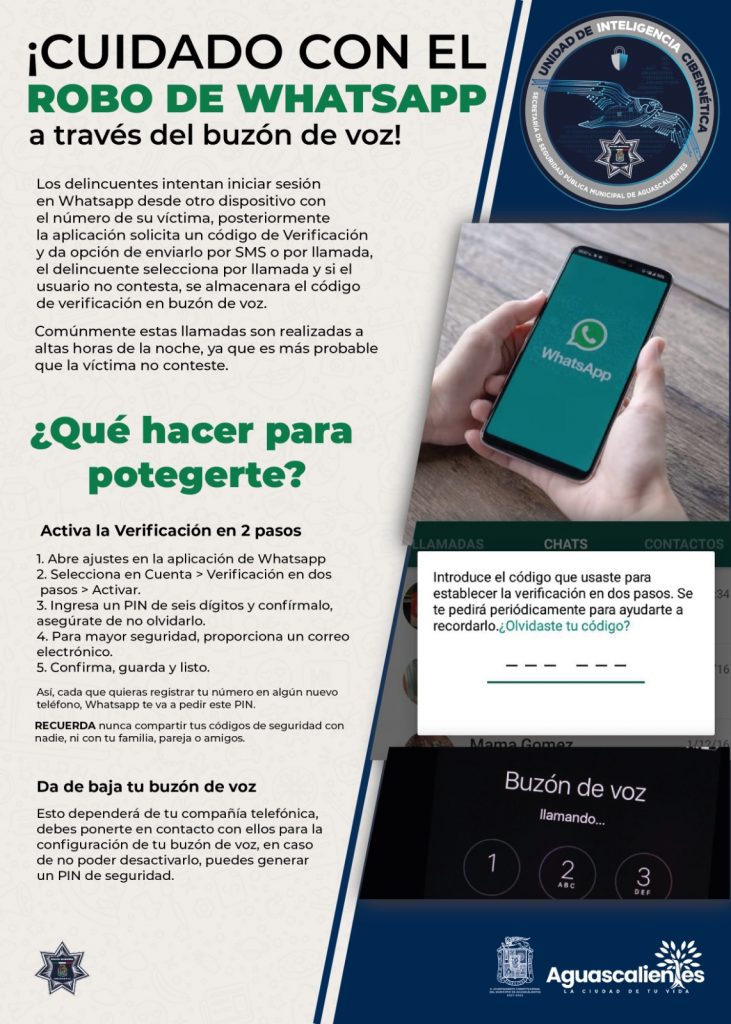 La Secretaría de Seguridad Pública Municipal de Aguascalientes (SSPM) a través de la Unidad de Inteligencia Cibernética (UIC) hace un llamado a la ciudadanía a realizar la verificación de dos pasos en el WhatsApp en su teléfono celular y evitar el robo de esta aplicación que generalmente los ciberdelincuentes utilizan para pedir dinero a los contactos del usuario afectado.