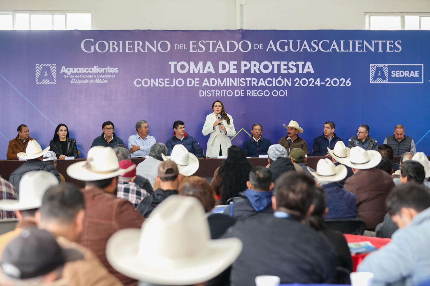 La gobernadora de Aguascalientes, Tere Jiménez, tomó protesta a la nueva mesa directiva de la Asociación de Usuarios de la Junta de Aguas del Distrito de Riego 001, donde llamó a todos los productores a redoblar esfuerzos para consolidar este proyecto que representa la sustentabilidad de Aguascalientes.