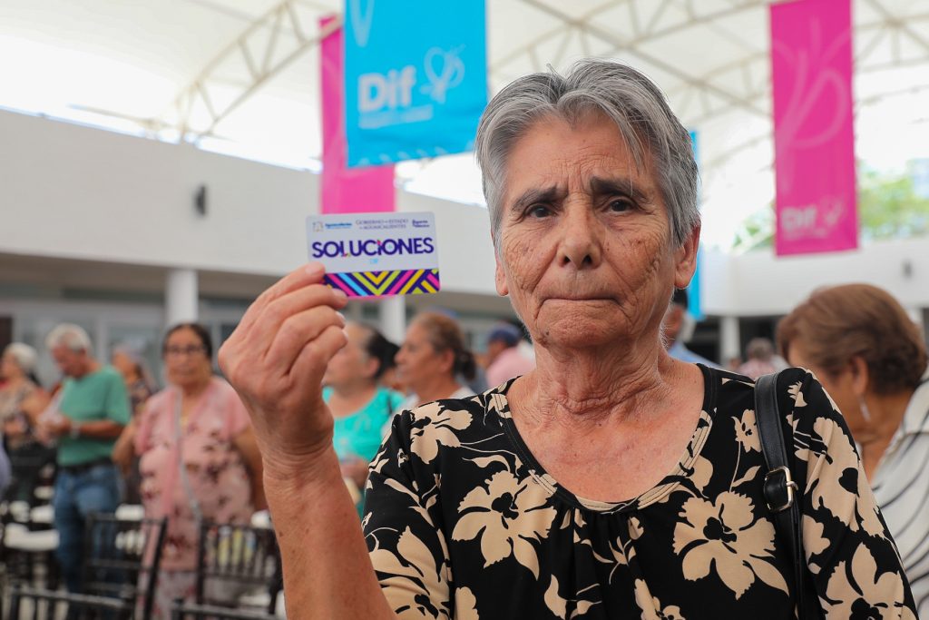 Tere Jiménez detalló que con la Tarjeta Soluciones tendrán muchos beneficios; podrán realizar trámites y recibir descuentos en diferentes establecimientos, además de acceder a medicinas, operaciones, becas para sus nietos y mejoras para sus viviendas, entre otros beneficios.