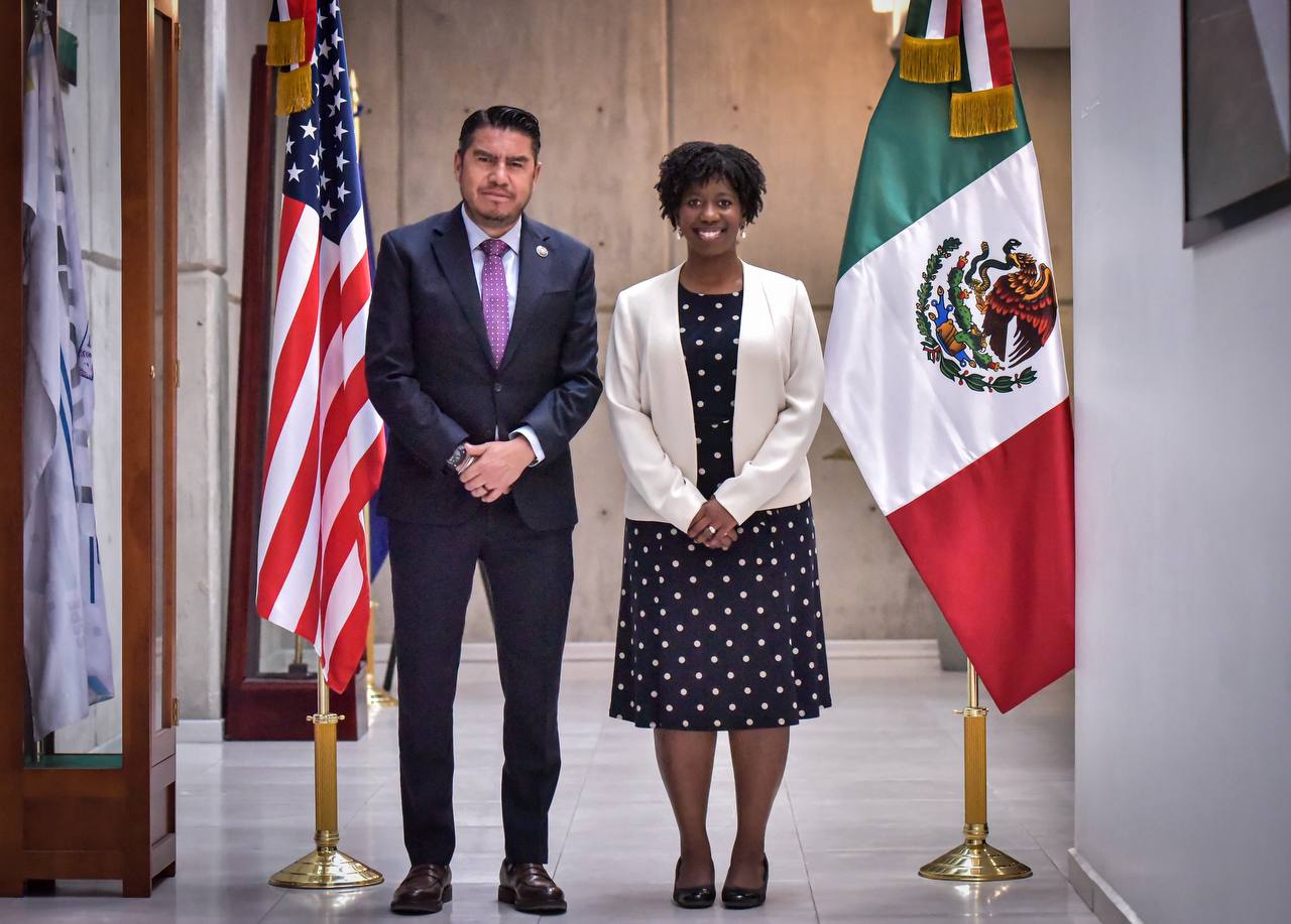 En la reunión estuvieron presentes Brittany Thompson, cónsul de Prensa y Cultura; María Elena Saucedo, especialista en Educación; Marco González, especialista de Prensa; Michelle Olmos, directora general del C5i; así como Cecilia Pacheco Rangel, rectora de la Universidad de la Policía y Ciencias de la Seguridad.