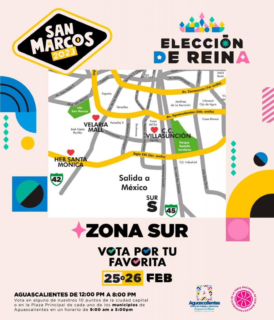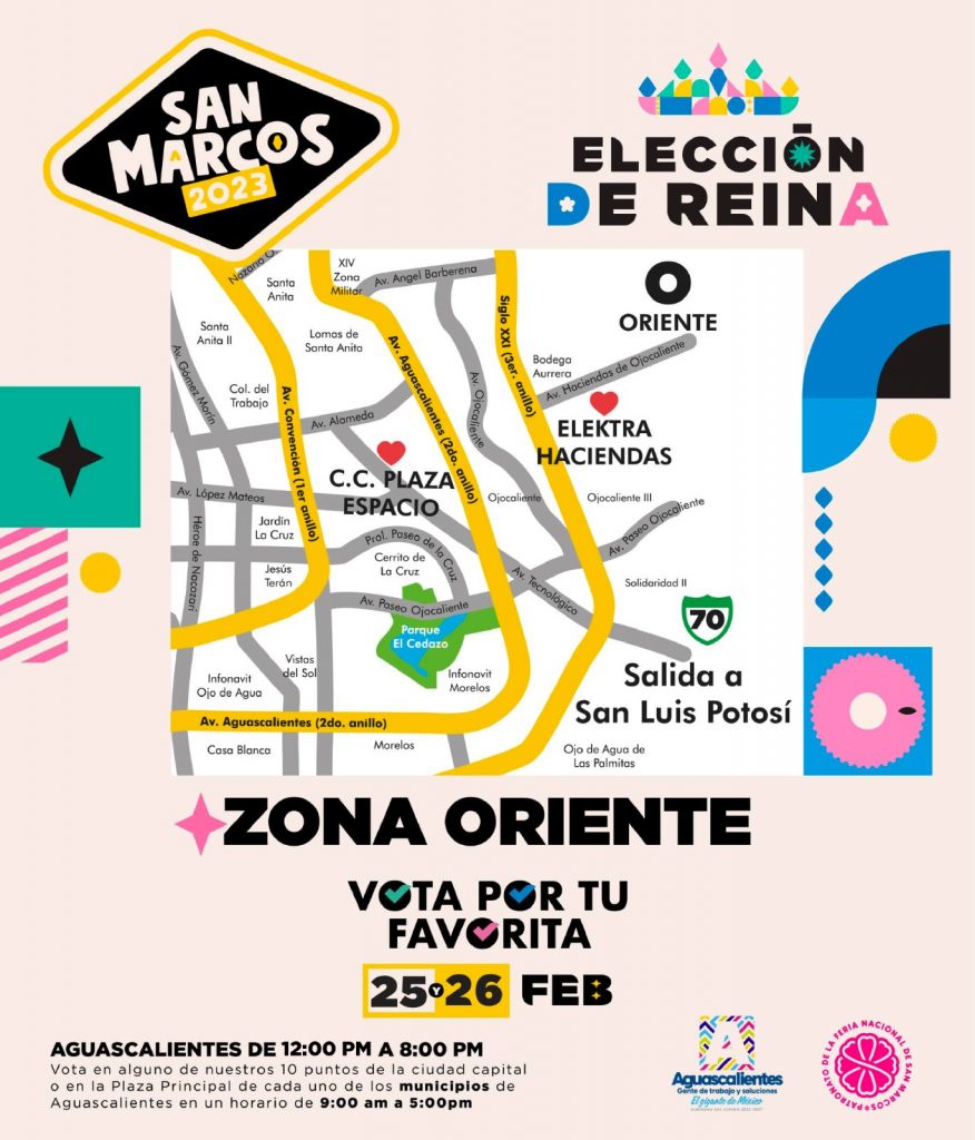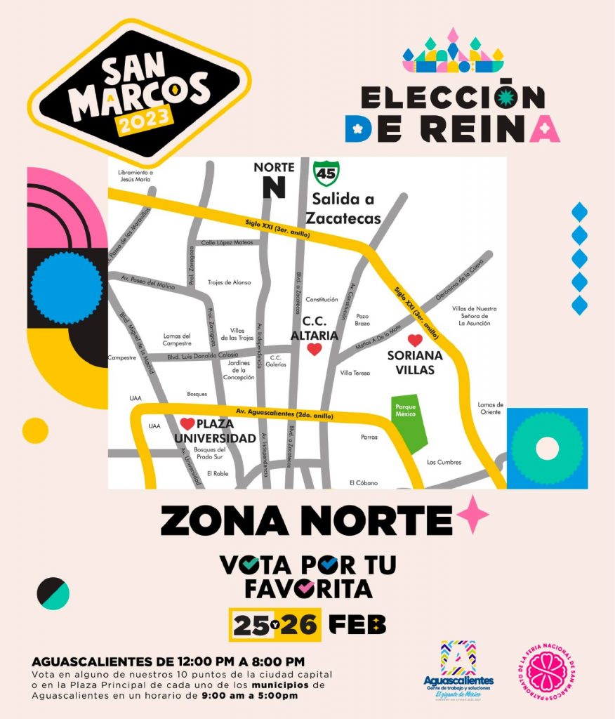 En tanto que en los municipios de San José de Gracia, Asientos, Cosío, El Llano y Tepezalá, la gente tendrá la oportunidad de elegir a la reina de la Feria de San Marcos el sábado 25 de febrero; mientras que el 26 podrán hacerlo los habitantes de Jesús María, Calvillo, Rincón de Romos, Pabellón de Arteaga y San Francisco de los Romo; en los 10 municipios las urnas estarán disponibles de las 09:00 a las 17:00 horas.