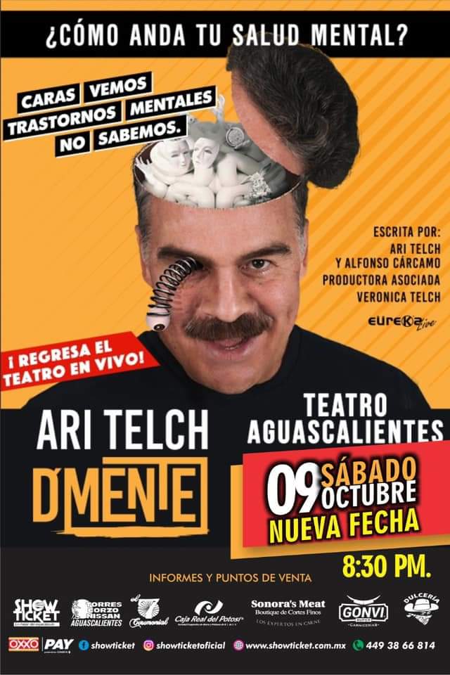 D’MENTE llega a Aguascalientes con ARI TELCH este 9 de octubre al teatro Aguascalientes, 20:00 hrs. única función… obra super divertida donde sabrás si padeces depresión, ansiedad, bipolaridad o algún trastorno mental tú o alguien de tu familia, venta de boletos por showticket, 7 ceremonial, cajas real del potosí, sonora meat.